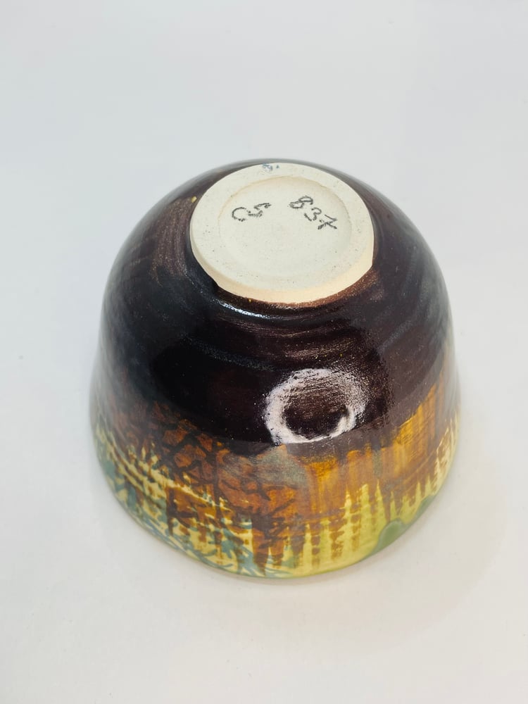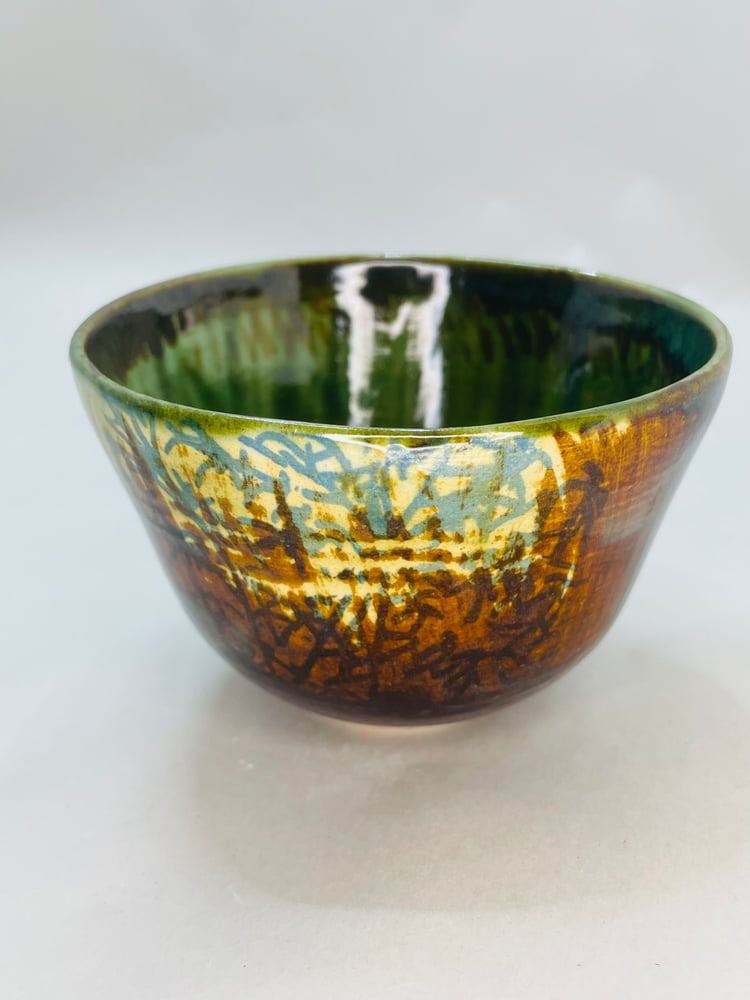 A Waveney Valley Willow thrown ceramic vessel decorated with Amaco glazes Tourmaline and Iron Lustre with an original drawn screenprint. The design is inspired by the willow trees, hedgerows, tracks and waterways of the Waveney Valley on the border of Norfolk and Suffolk.
